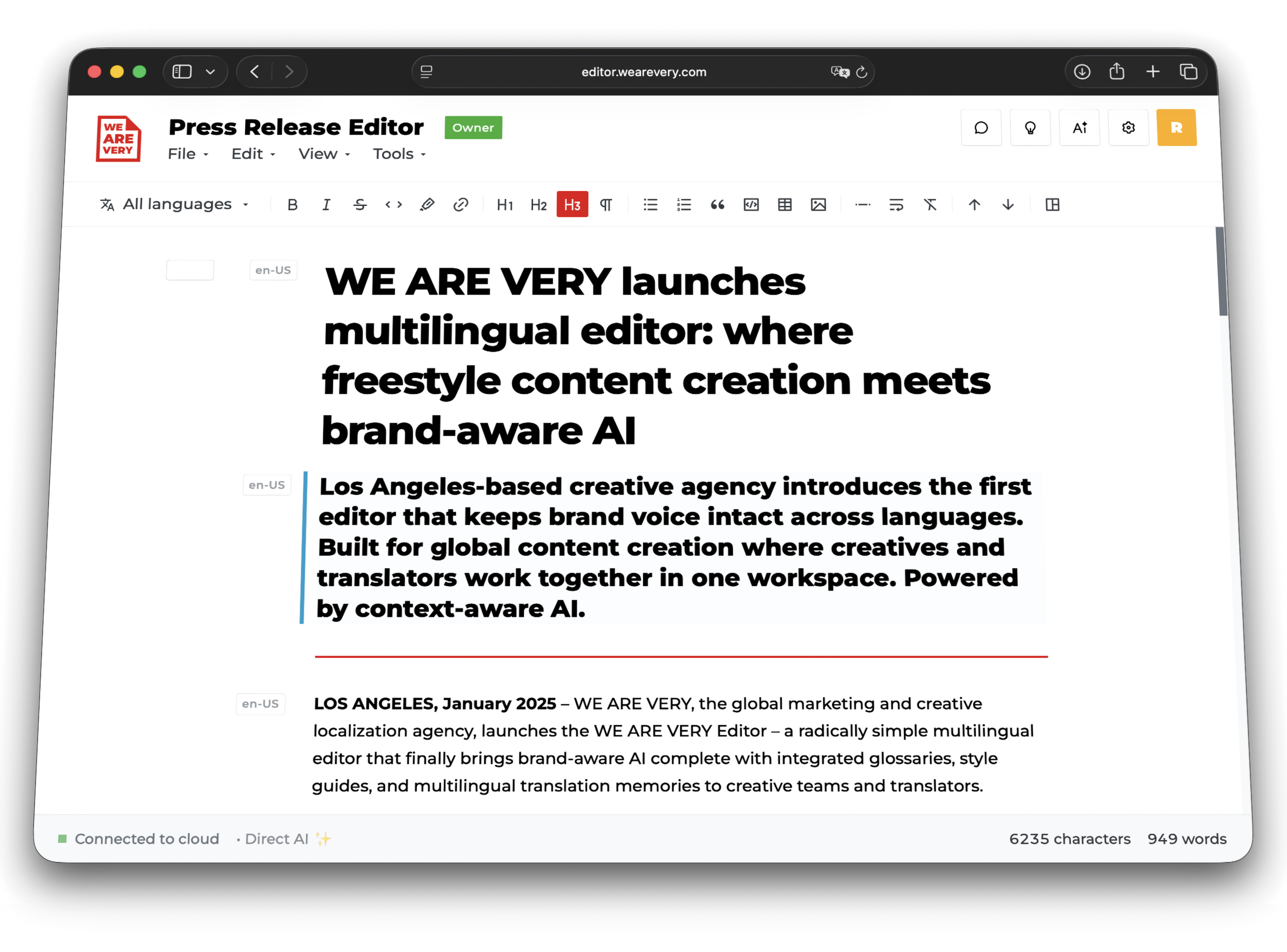 Packed with AI, this platform comes with a freestyle-editor featuring real-time collaboration, smart suggestions, integrated glossary, translation memory and style guide tools.