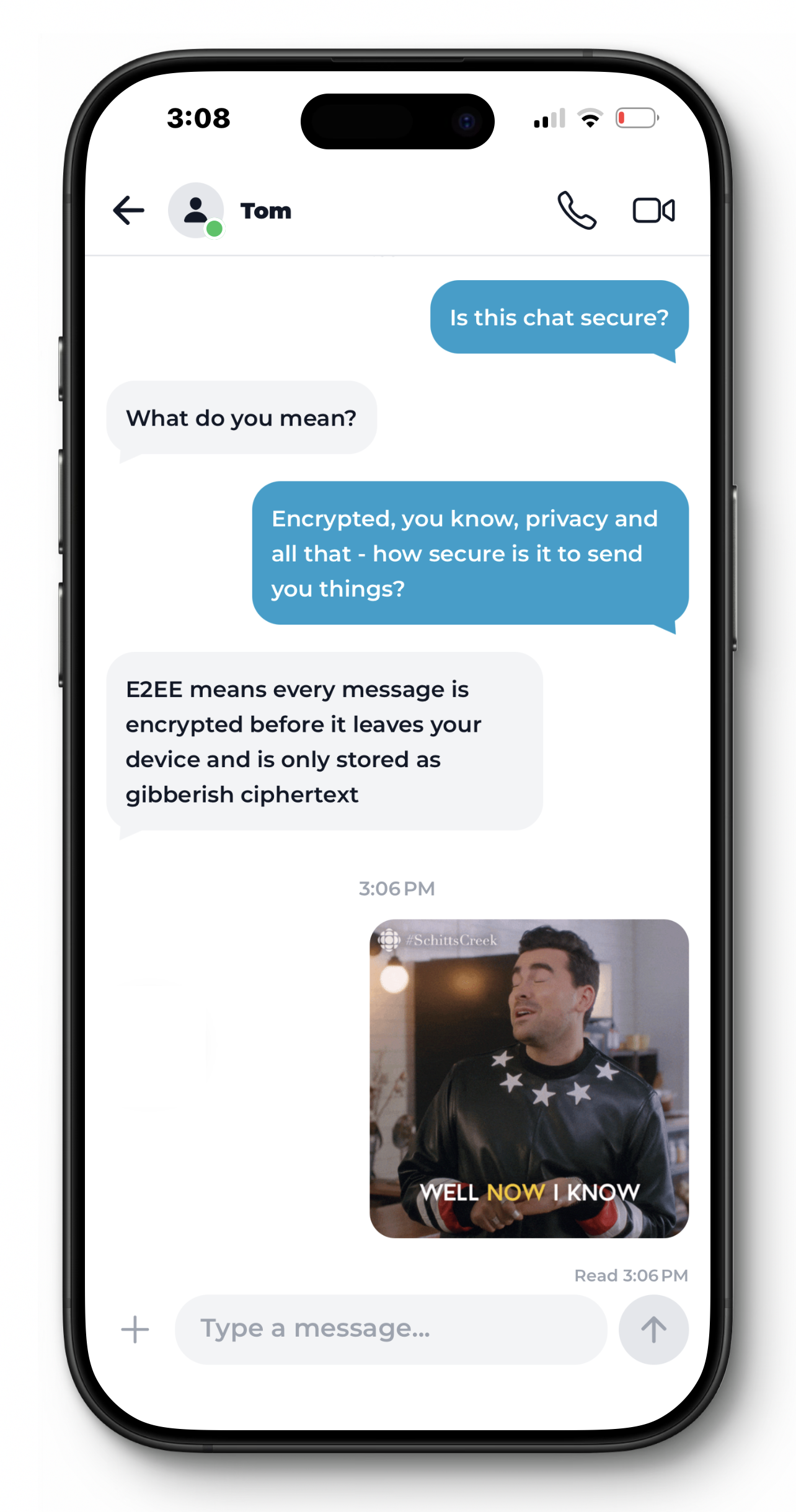 End-to-end encrypted private messaging – your messages and calls in the private layer are encrypted on your device before they leave it.